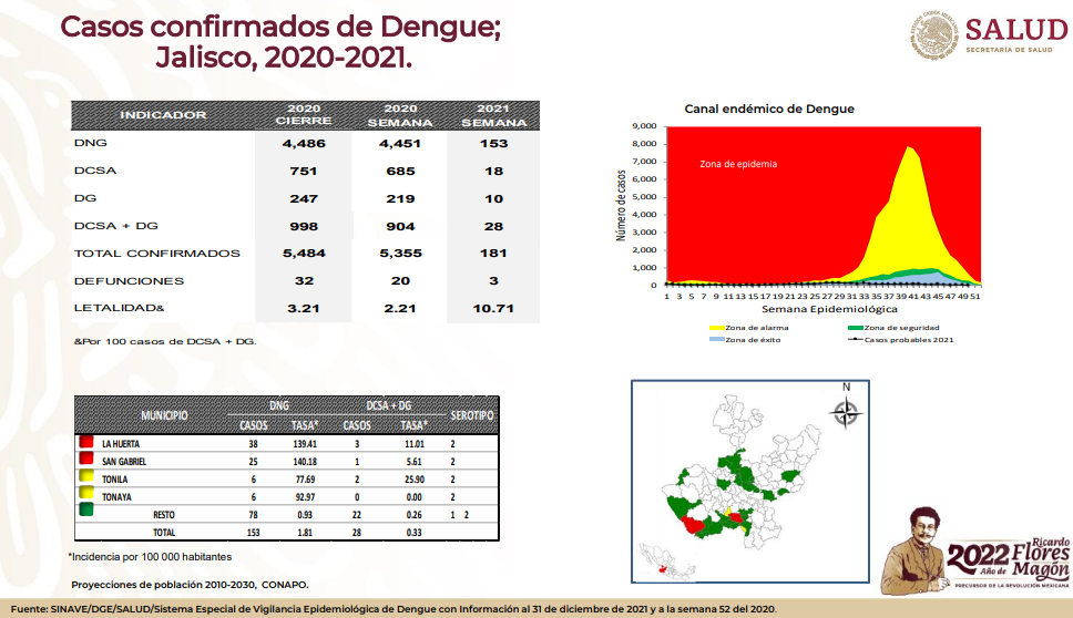 El dengue, chikungunya y zika son enfermedades del grupo de las arbovirosis, transmitidas por los mosquitos Aedes aegypti y Aedes albopictus. Las enfermedades causadas por arbovirus, se han incrementado tanto en incidencia como en distribución geográfica; tan sólo en el estado de Jalisco durante el periodo del año 2020-2021 se reportaron los siguientes datos ante la Secretaria de Salud acerca del Dengue. (Fig. 1).
